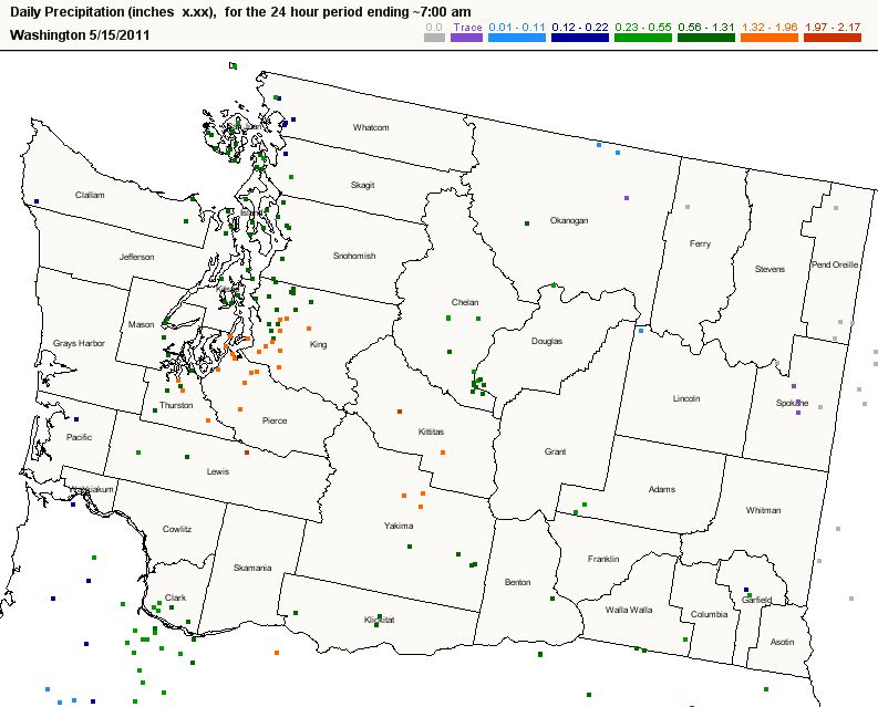 And don't forget eastern Washington where the Mazama-Chelan area received 1-1.5 inches. And Mark Albright, past WA State Climatologist, noted that Yakima with 1.76 inches in the past 18 hours alone is wetter than any May since 1948 when 2.76 inches of rain fell. The 2nd wettest May total was 2010 with 1.46 inches in Yakima. The total so far in 2011 is 1.90 inches through late morning 15 May 2011. Mean May precipitation in Yakima is 0.54 inches.